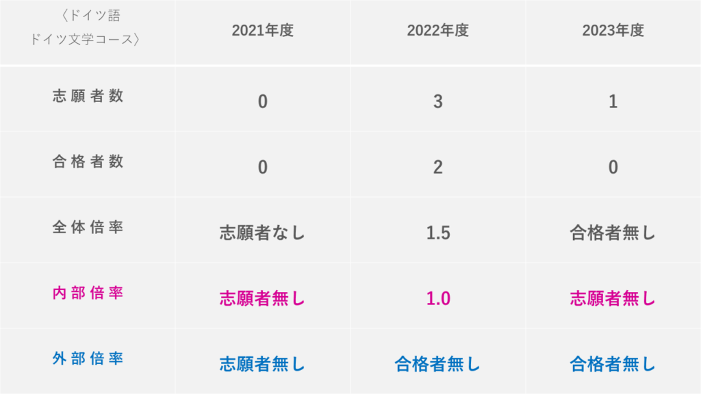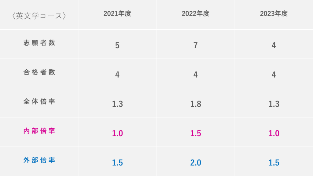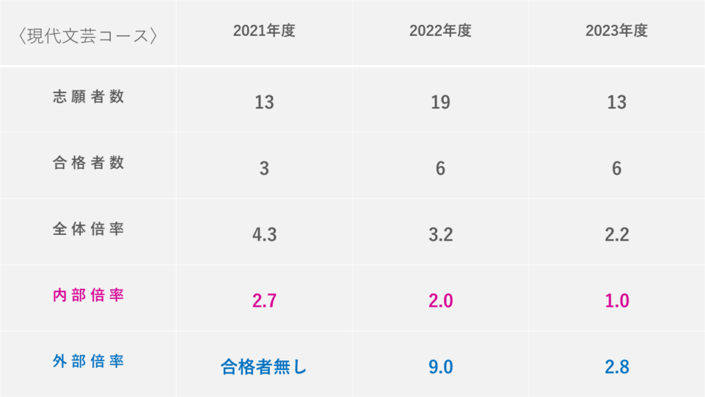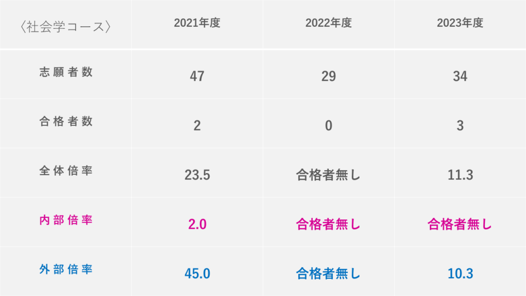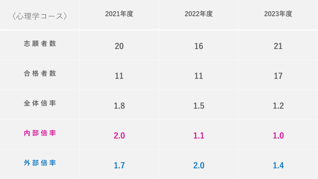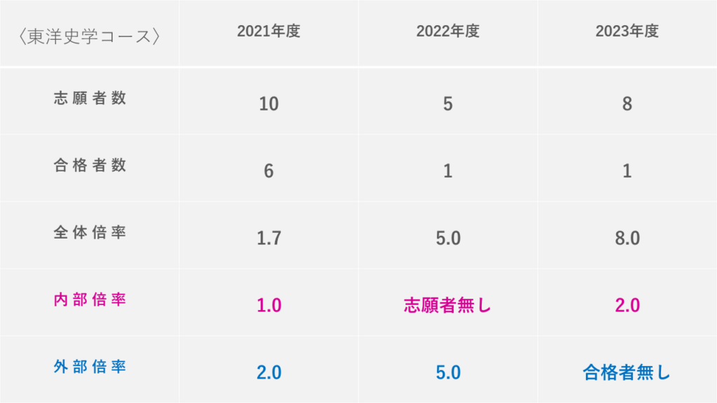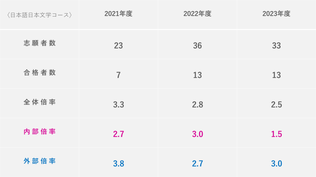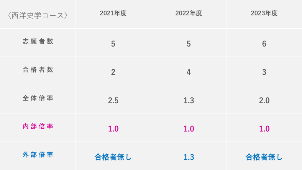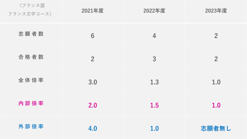 文学研究科などは内部・外部の情報を公開しており、見てみると「内部倍率より外部倍率の方が低いこと」も多々ありました。