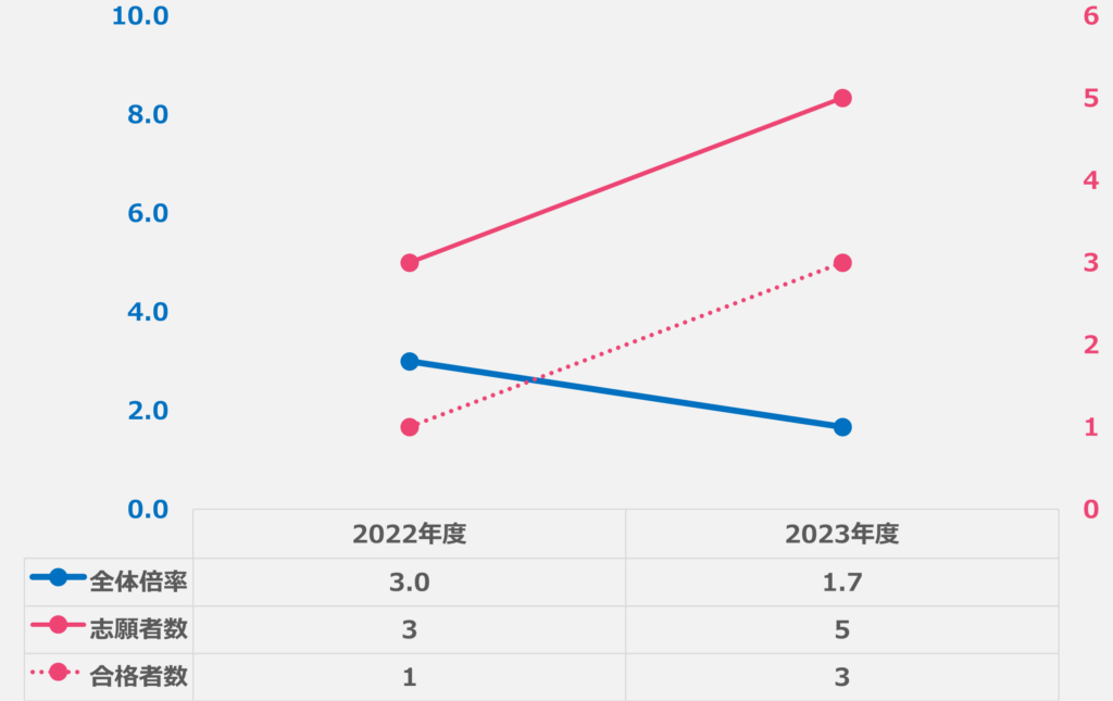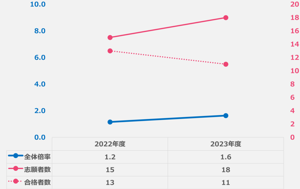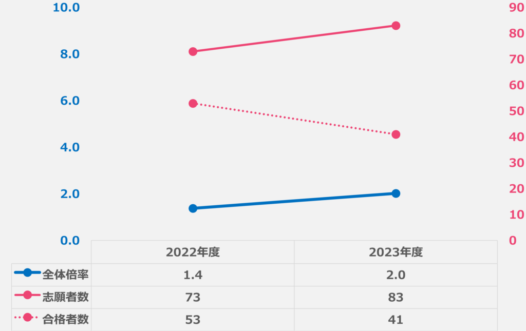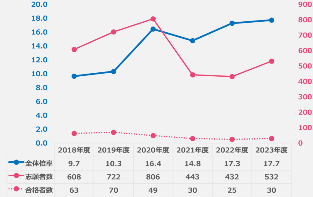 ※ 一次選考合格者・最終合格者共に、10から始まる5桁の受験番号、下3桁の最大値が同じだったため、これを志願者数とした(10128が最大値の場合、志願者数は128人)
