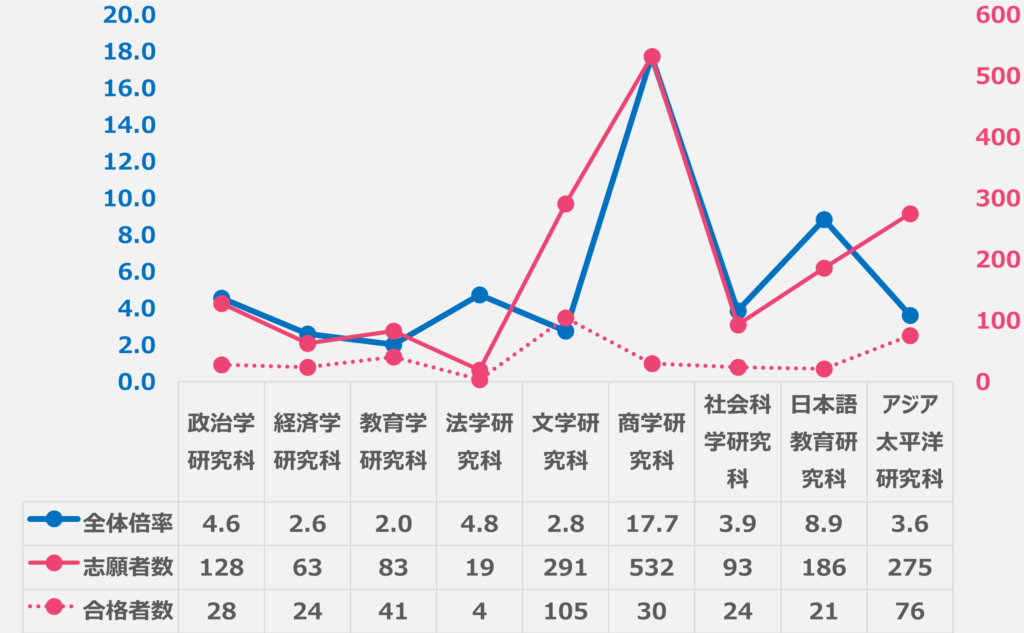 特に、商学研究科は志願者数が最も多いが、合格者数は他の研究科と同様に少数であり、倍率が非常に高い印象です。